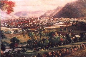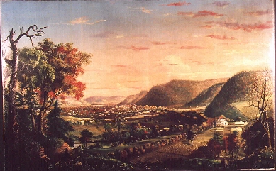 In February of 1996 an intriguing landscape painting- “View of Bath, NY From the West” came into our lab at WestLake Conservators. Although severely damaged and poorly restored in the past the painting showed a detail and a perspective in the depiction of the distant village and surrounding hillsides that I had never seen before in a 19th C. American painting. The painting was also unusually dark in the foreground from a staining coming up from underneath the paint layer and there appeared to be original wrinkling and shrinking of the ground layer indicating the possibility of a photo sensitive ground. This painting looked like a very accurate and important historical record of the time and place and its detail was amazing.