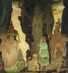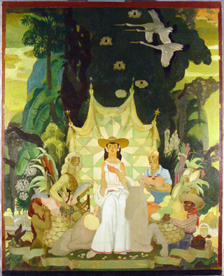 the revival of mural painting in America. He was deluged with mural commissions, including an assignment to paint several panels for the Texas Centennial Exposition, two murals for the New York World’s Fair, and murals for private houses in New Haven, San Antonio, New York City, White Plains and Greenwich. In 1939 he won a national competition to paint a third mural at the World’s Fair, a 104 by 34 feet painting for the Federal Building. When the vogue for murals later faded, as American artists preempted that scale for use in easel painting, Mahoney continued to produce murals and reverse glass paintings for various buildings in Baltimore, in Atlanta, in Ithaca, and elsewhere. All these works are distinguished by their suitability to site, an Art Deco opulence and by impeccable workmanship.