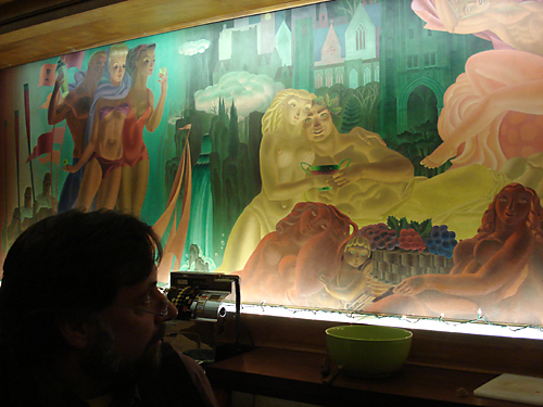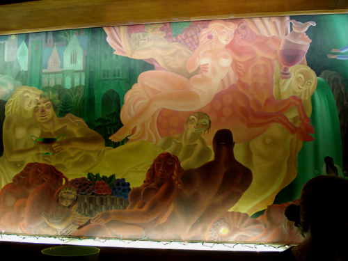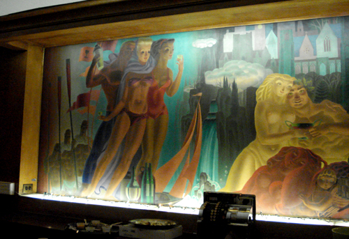 The Mural Lounge was completed in 1949. J. O. Mahoney, then Professor of Art at Cornell, painted the mural which gives this room its name. At Left are the falls, buildings at Cornell, and figures representing notable University activities, boating, swimming, crew racing, and “general conviviality”. The Central grouping contains characters from mythology headed by Bacchus, god of wine and merriment. A Centaur – half man, half horse – and assorted nymphs complete this area. On the Right are prominent city buildings, including the Clinton House, and figures suggesting Ithaca College specialties, drama, music, photography and physical education.